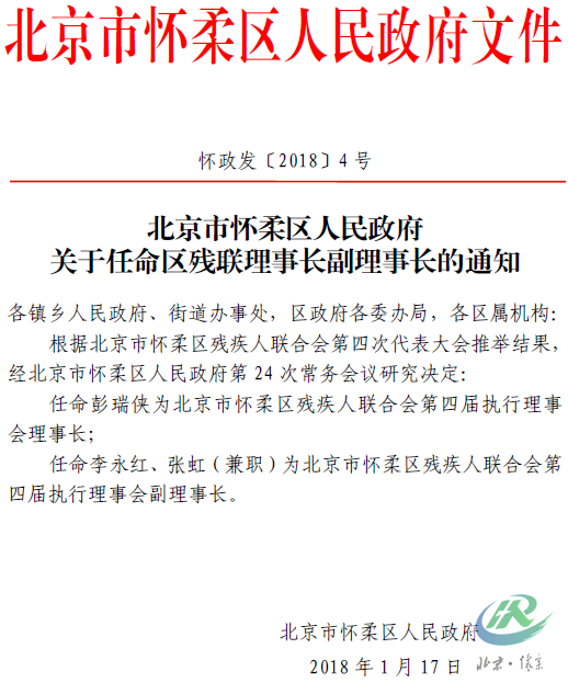 北京市怀柔区人民政府关于任命区残联理事长副理事长的通知