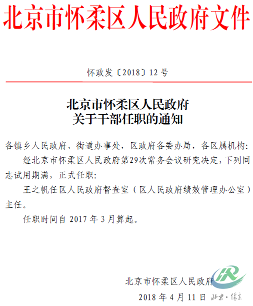 北京市怀柔区人民政府关于干部任职的通知