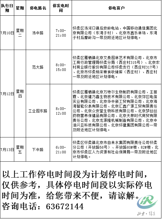 怀柔供电公司2018年第28周(7月9日到15日)停电公告